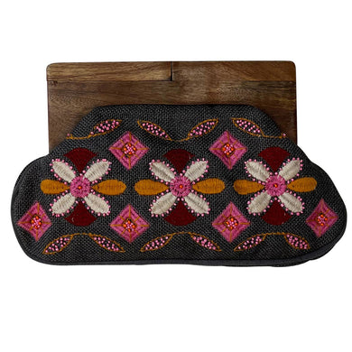 Charcoal Clutch with Pink Flowers Wooden Handle